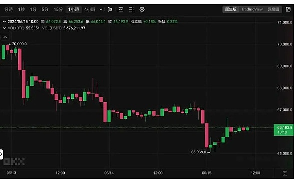 今日(15日)凌晨一点左右,比特币价格最低跌至65,068美元,创下近一个月来的最低点。截至撰稿时,比特币价格有所回升,现报66,193美元,24小时内跌幅缩窄至1%。