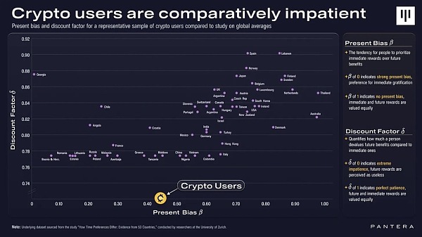 Pantera Research 的一项调查研究发现,加密货币用户通常表现出较高的即时倾向(Present Bias)和较低的贴现系数(Discount Factor),意味着他们更偏好即时满足。