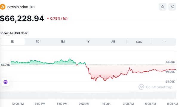 BTC 价格持续看跌,交易价格为 66,228.94 美元,较昨日下跌 0.79%。其 24 小时低点和高点分别为 65,049.23 美元和 67,294.65 美元。