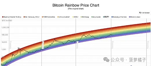 首先,比特币价格彩虹图是一种使用对数增长曲线的长期估值工具,它表明现在仍然是购买 BTC 的好时机。该图表有助于预测比特币的潜在价格走向,并表明当前价值仍然是一项有价值的投资。