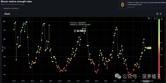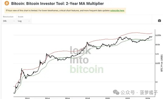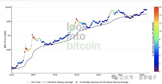 第三,200 周移动平均线热图显示,比特币当前价格点仍处于蓝色区域。这表明价格尚未达到峰值,现在是持有并可能购买更多 BTC 的好时机。