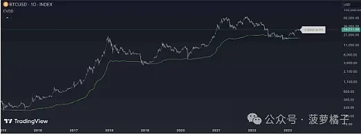 第四,累计价值销毁天数(CVDD)指标显示,当比特币的价格达到绿线时,它代表着一种被低估的资产和良好的买入机会。当前的 CVDD 值表明 BTC 尚未达到峰值。