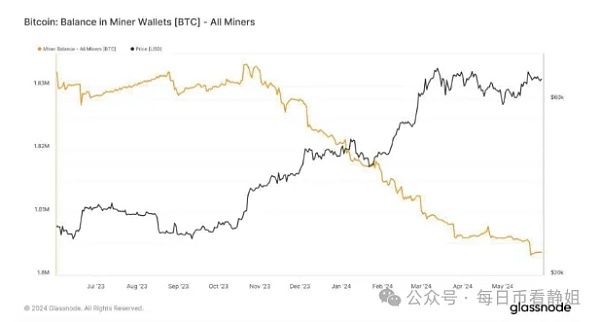 根据Glassnode 的数据,比特币矿工余额一直在稳步下降,由于 2024 年 4 月比特币减半后抛售增加,创下多年新低。根据 Glassnode 的数据,余额已从 2023 年初的 184 万 BTC 下降到 2024 年 5 月的 180 万 BTC。这一趋势凸显了矿工在区块奖励减少后需要支付运营费用。
