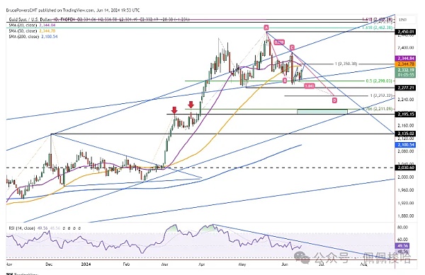 另一个需要关注的阻力价格区域是略高于50日均线的2350美元,该价格完成了小幅上涨ABCD模式的初始目标。并且它包含在上周五的宽幅价格区间内,这本身就影响了价格的波动。上周五的2388美元高点以看涨突破开始,但以失败的突破和看跌收盘结束。因此,鉴于黄金目前的价格模式,似乎需要突破2388美元以上才能维持牛市逆转并创下新高。否则,支撑位仍有被突破的风险。