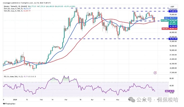 多头的时间不多了,为了防止下跌,他们必须努力将价格维持在20日均线上方。然后,比特币可能攀升至70000美元,随后升至72000美元。