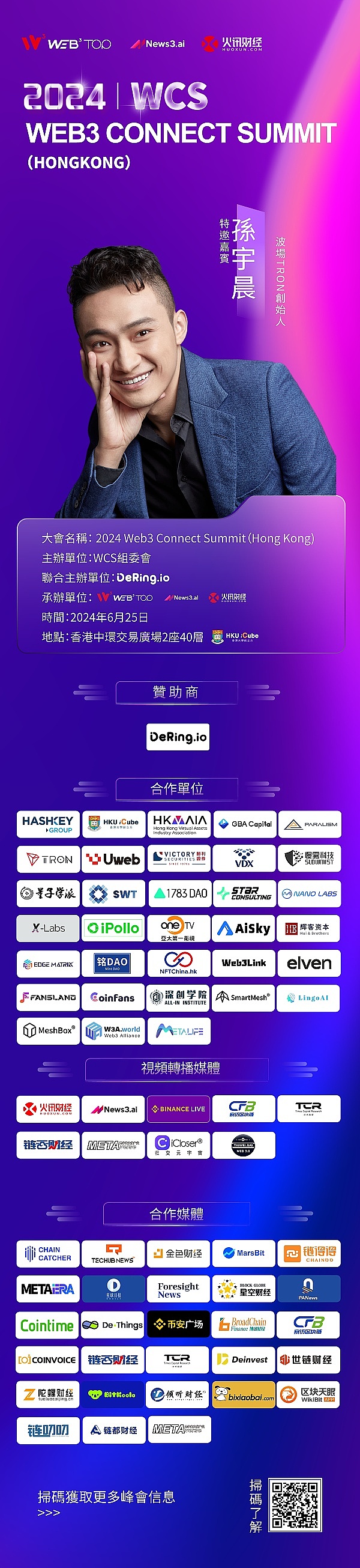 此次活动由WCS组委会主办,Web3TOP、News3.ai、火讯财经承办。大会以“深度链接,品牌破圈”爲核心价值,旨在聚集全球Web3精英,共同探讨Web3与实体世界的创新融合,以及香港虚拟资産政策与商业发展的创新机遇。
