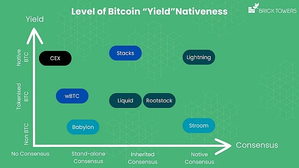 无共识:这一类别代表中心化平台,其基础设施仍然是链下的。例子包括 Celsius 或 BlockFi 等中心化平台,这些平台对用户资产拥有完全的托管权,使用户暴露于对手方风险和对中介机构的依赖。虽然这些平台利用了比特币,但其收益策略主要通过传统金融机制在链下执行。尽管是向比特币采用迈出的一步,但这些平台高度集中,类似于传统金融机构,且往往未受到监管。