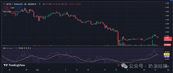 从 4 小时图可以看出,AEVO 自 4 月下旬开始呈现下跌趋势,价格从 5 月中旬的 0.85 美元跌至低点。在此期间,RSI 徘徊在超卖区域,经常跌破 30 水平,表明看跌势头强劲。