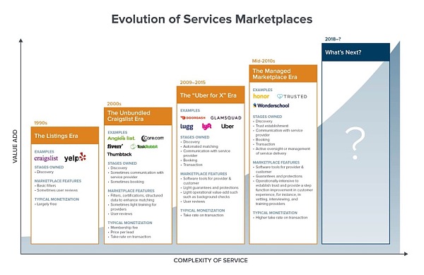 我曾写过一篇关于服务市场时代的文章,阐述了互联网市场类别是如何从 90 年代以 Craigslist 为代表的列表时代演变到按需应用的 「Uber for X」时代(2009-15 年),以及后来的管理市场时代(2010 年代中期)。