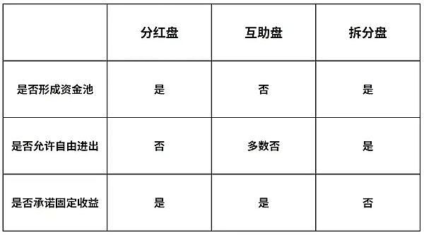 互助盘:A 给B 打钱,B 给C 打,C 给A 打从而形成流水错配,按笔结算收益;