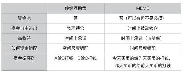 MEME 币其实是一种时间尺度上的资金错配。我们假设在牛市,某个MEME 币一直强势上涨,那么其实是,今天高价买币的打钱给昨天买币的,昨天买币的打钱给前天最低价买币的。而因为时间本身的唯一性,又形成了「被动锁仓」,所以我们就有了下图的对比: