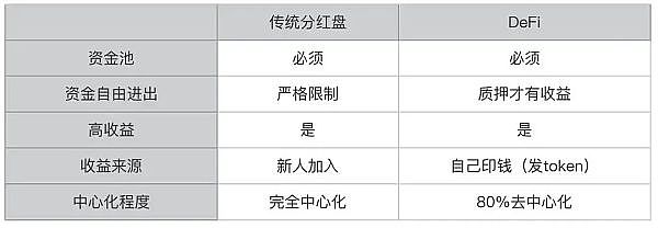 DeFi 是典型的分红盘,因为分红盘的基本逻辑就是「一次性投入一整笔资金,随时间线性分红获得收益」,是不是和上面的做法一模一样?我们同样有下图的对比: