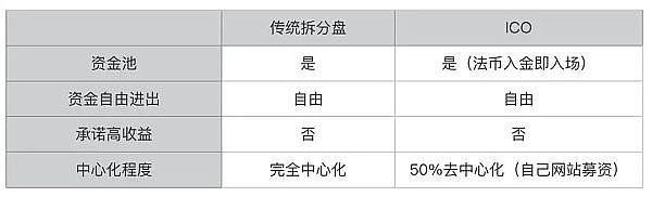 我们知道,拆分盘是将一个资产标的不断拆分成新的标的。通过新低价标的吸引增量资金。收益通过标的增值实现,这不正是ICO 的表现吗?如果我们把当时加密货币这个赛道看做一个资金盘的话,各种ICO 的出现正是把加密货币这个资产标的,不断通过「新的故事」来拆分成新的投资标的(新的ICO 代币),以此来吸引增量资金。于是我们仍旧有了对比图: