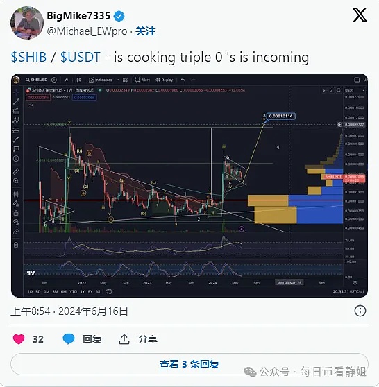 此类市场结构通常表示上升趋势暂停,导致在上升趋势恢复之前出现一段时间的看跌盘整或下降趋势。柴犬要继续上升趋势,必须突破市场动荡形成的下行通道。Michael 预计这一突破将很快发生。