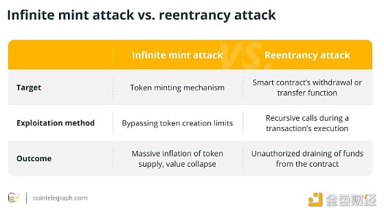 无限铸币攻击旨在创建无限数量的代币,而重入攻击则采用提现机制来不断消耗资金。