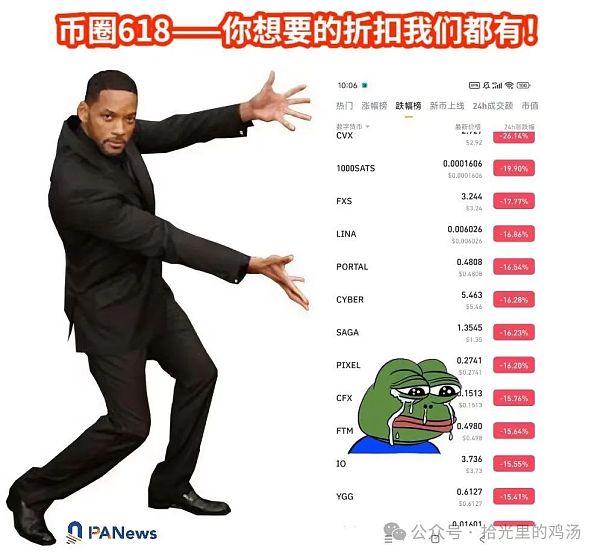 “618”打折的不止是电商平台,还有整个币圈的市场。昨天一觉醒来,所有现货玩家眼前一片血红,连跌幅不多的币都能上涨幅榜了,简直前所未见。