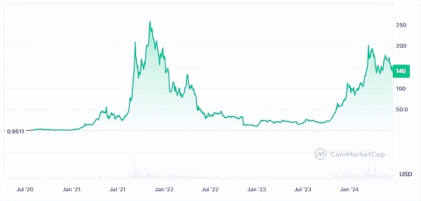 Solana 的炒作正在慢慢减少,因为其价格在市场上已经下跌了很长时间。此前,Solana 的价格在 3 月份曾达到 202 美元的高点,但今天已跌至 140.58 美元。3 月份的看涨表现是其向 260.06 美元的历史最高目标做出的最佳尝试,而这一目标三年来一直未能实现。