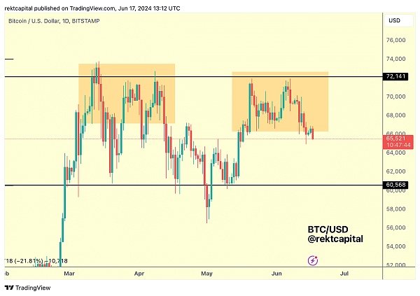另一位加密货币分析师 Rekt Capital 表示,BTC 价格倾向于在区间高点阻力位(约 71,600 美元)附近形成价格走势集群。随着时间的推移,这会导致价格回撤至下行,从而导致在区间低点支撑位(约 60,600 美元)附近形成价格走势集群。