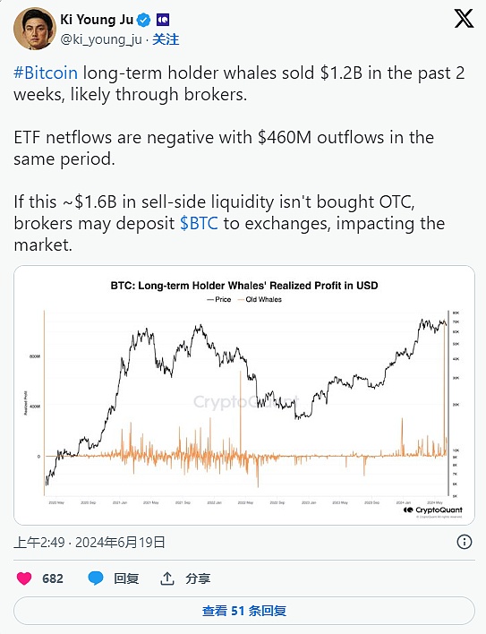 与此同时,长期鲸鱼在过去两周内通过经纪商出售了价值 12 亿美元的 BTC。在同一时期,比特币 ETF 的流出量飙升至 4.6 亿美元。Ju 警告称,如果 16 亿美元的卖方流动性没有在场外吸收,经纪商可能会开始将比特币存入交易所,从而导致进一步下跌。
