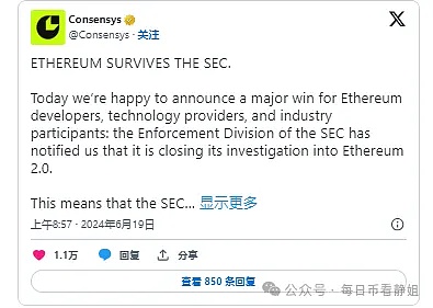 在详细的帖子中,该公司表示,该通知是对一封信的回复,该信是为了确认该机构决定结束调查后是否批准现货 ETH ETF。对此,SEC 通知了其结束调查,然而,这家区块链公司预计将继续为在 SEC 非法加密货币打击行动中遭受损失的开发商、技术提供商和交易员伸张正义而战。