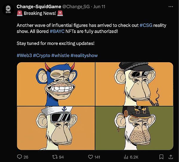 原生真人秀《CSG》是一部创新的直播式的真人秀,全球范围内聚集了一批因合约爆仓创业失败的币圈从业者。通过竞赛机制最终获胜者将获得巨额奖金。项目的发起方不只由多家比特币项目基金,还有多位持有无聊猿的大佬。篮球巨星库里就是其中一位。据知情人透漏,斯蒂芬.库里不只参与了这场web3的《鱿鱼游戏》,他还投资了该家印度的娱乐机构。他曾说过,投资区块链并非是为了娱乐,而是相信数字货币和体育一样,都对人类的和平进步起到推动作用。