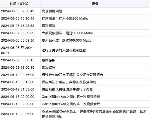 为了社区可以更透明地了解事件全貌,CertiK提供了事件发生时间线以及测试存款交易明细: