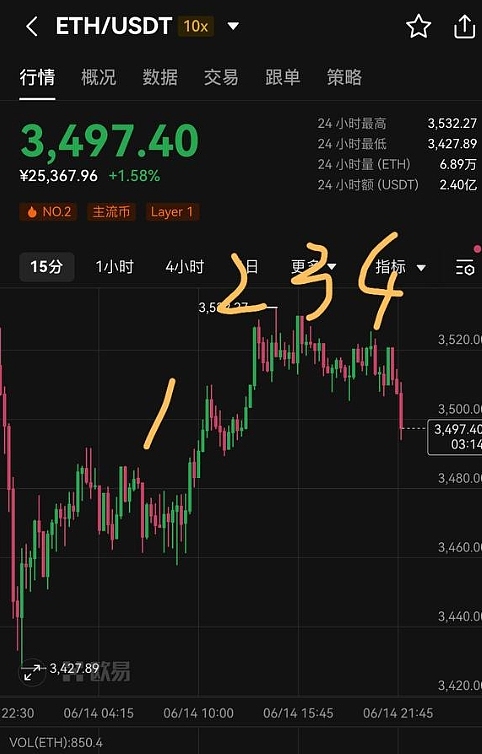 这就是15分钟的1234。4如果跌破1,就是熊。没跌破又涨上去,就是还在1小时或者2小时以上的1。