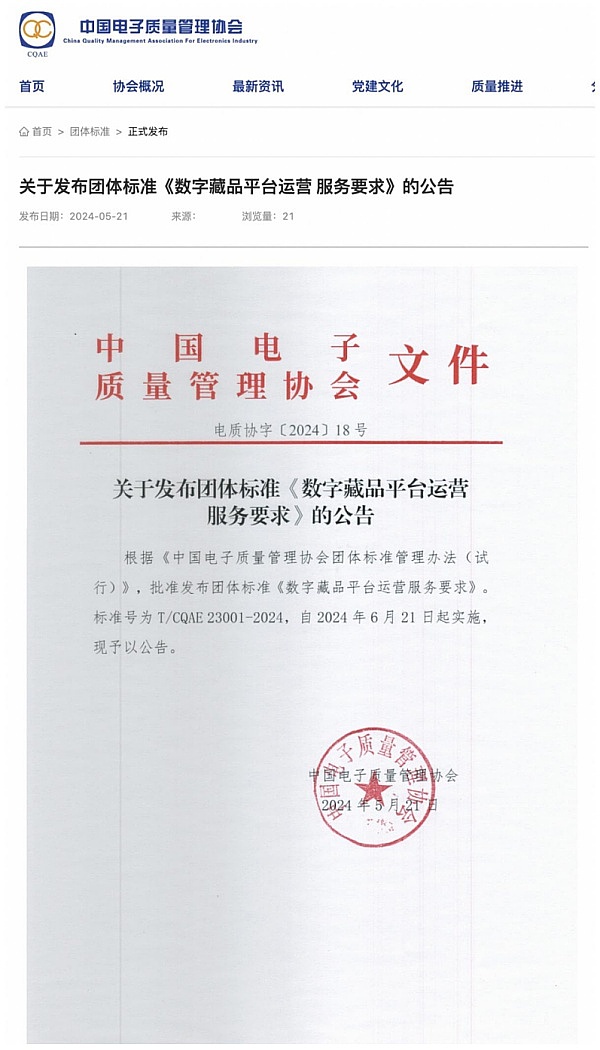 近日,由中国电子质量管理协会提出并归口的《数字藏品平台运营服务要求》团体标准正式发布,该标准由iBox、北京金谷远见科技集团有限公司、中国传媒大学等单位联合起草,并于2024年6月21日起正式实施。