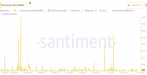 此外,根据 Santiment 的数据,MKR 交易所流入量在过去一周内出现下降。交易所流入量从 6 月 12 日的高点 5799 降至 17 日的低点 177。