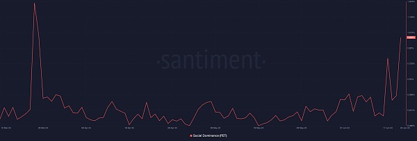 FET 在过去 24 小时内的表现使其社交主导地位有所上升。截至发稿时,FET 的社交主导地位为 0.96%,这一水平创下了 3 月份以来的新高。