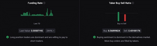 衍生品市场的情况也相当乐观。例如,其接受者买入/卖出比率为绿色,这意味着购买情绪在衍生品市场占主导地位。