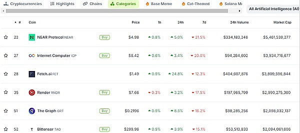 自 AI 晶片巨擘辉达 (Nvidia) 超越微软,成为全球市值最高企业后,币圈的 AI 相关代币也随之起舞,Fetch.ai (FET) 与 SingularityNET (AGIX) 24 小时涨幅近 25%,在比特币和以太币等蓝筹币横盘整理之际,AI 代币都有不错的表现。