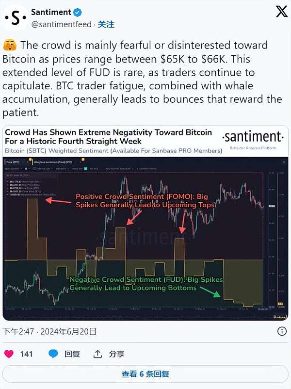 这是根据链上分析公司 Santiment 的说法,该公司在微博平台 X(以前称为 Twitter)的一篇文章中指出,“随着交易员继续屈服,这种 FUD [恐惧、不确定性和怀疑] 的延长正在发生。”