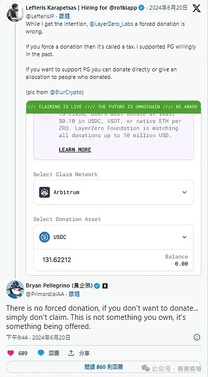 对于社群质疑此举等于强制征税,LayerZero 共同创办人兼执行长Bryan Pellegrino 昨晚也在X 上回应表示: