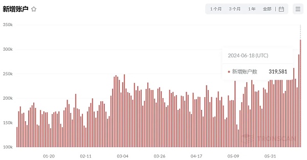 区块链浏览器TRONSCAN数据显示,6月18日,波场TRON新增账户数达31.9万,创本年度新高。近1个月,波场TRON日均新增账户数达24万。