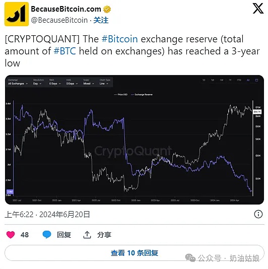 比特币交易所储备量(衡量可在交易所交易的数字货币数量的指标)已跌至三年来的最低点。根据 CryptoQuant 的数据,可用的比特币数量有所下降,这表明供应量受到限制,并可能影响市场。