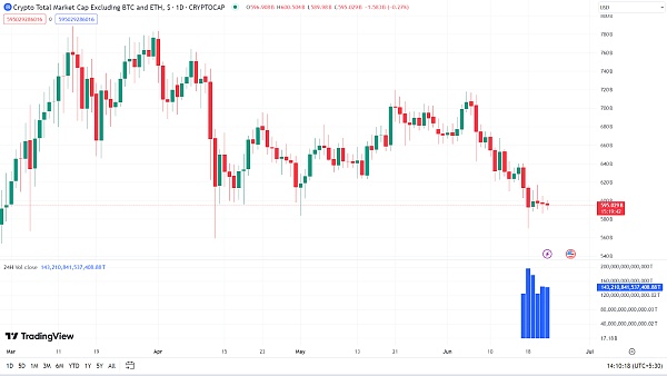 根据显示 BTC 和 ETH 以外的加密资产总市值的图表,6 月历来是山寨币的艰难月份,今年也不例外。截至 2024 年 6 月 22 日,总市值为 5949.67 亿美元,过去一个月下跌 14.30%。与 6 月初的 7066.76 亿美元的峰值和 3 月 31 日的 7753.6 亿美元的年度高点相比,这是一个显着的下降。