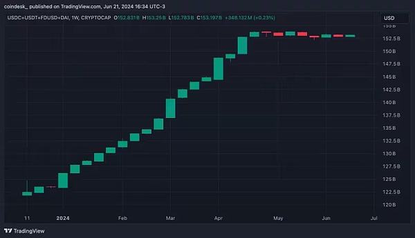 加密货币市场的流动性流入已经停滞。从稳定币市值就可以看出这一点,今年早些时候增长了 300 亿美元后,稳定币市值自 4 月以来一直保持平稳。前四大稳定币(USDT、USDC、FDUSD 和 DAI)的总市值显示交易活动和加密货币投资者兴趣有所减少。