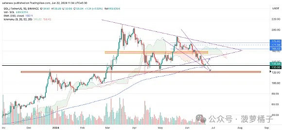 在面临决定性对称三角形上部阻力的拒绝后,SOL 价格继续在下降楔形内交易,并处于盘整的顶点。从这里开始,如果多头表现出强势,那么价格可能会保持上升盘整并进入三角形。否则,如果他们表现出疲软,代币可能会失去 200-EMA 支撑位 130 美元并走向下部支撑区域,这似乎是一个趋势反转区域。