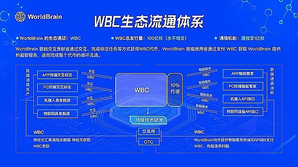 WBC是 WorldBrain 的生态通证,总发行量为100亿枚(永不增发),代谢通缩至1亿,是整个生态有机交互和正螺旋运转的基石。WorldBrain 智能交互贡献者通过交互、完成标注任务等方式获得WBC代币,WorldBrain 智能使用者通过支付 WBC 获取 WorldBrain 提供的超智服务,进而完成整个代币的循环流通。