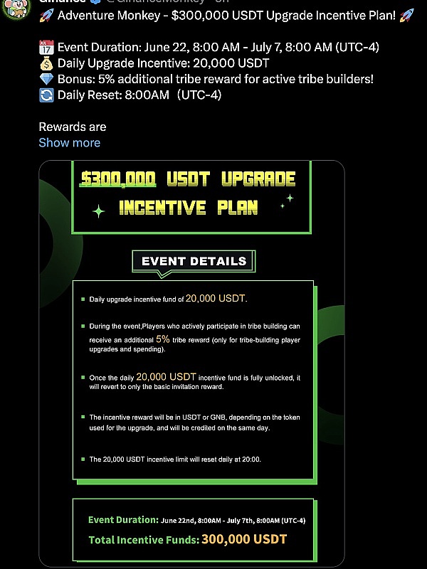 关于“30万USDT进阶激励计划”在小编发布文章时,GINANCE官方已经公布了活动详情。据了解,GINANCE的冒险猴游戏一直以来就拥有非常完善的社区推荐奖励系统,玩家在游戏内建立自己的部落将会持续获得更多奖励。此次的激励计划旨在鼓励用户积极拓展部落成员,并推动部落用户升级。活动期间,玩家可获得5%的直接邀请用户的升级返利。