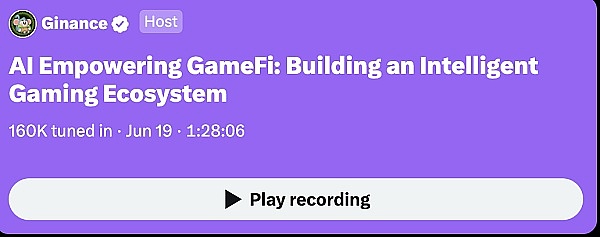 的首场Space直播活动,邀请了合作伙伴Oyster Labs及多位知名行业影响力者。直播期间,GINANCE与合作伙伴及众多行业专家深入探讨了Web3行业中AI与社交元素对GameFi发展的推动作用,并探索了更多元化和可扩展的方向。