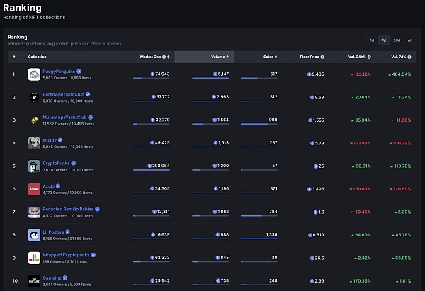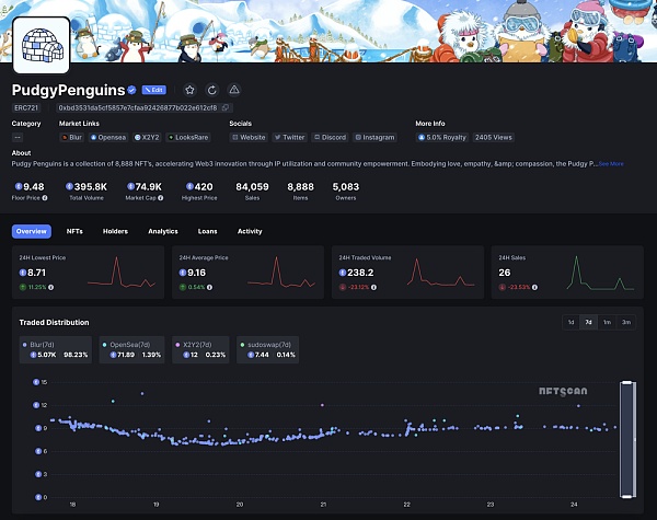 NFTScan 数据显示 Pudgy Penguins 交易额 7d 上升 484.54%,目前地板价稳定在 9.48 ETH,最高成交价 420 ETH,7d 交易额为 5.1k ETH 左右,目前以太坊上总交易额已超 395.8k ETH,过去 7 天交易分布主要为 Blur: 5.07K(98.23%),Opensea: 71.89(1.39%),X2Y2: 12(0.23%),sudoswap: 7.44(0.14%) 单位 ETH,7d 交易笔数达 624 次。
