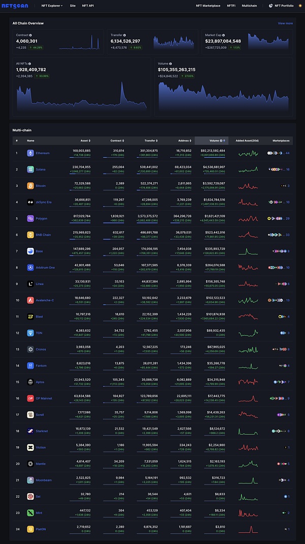 截至 2024 年 6 月 24 日,NFTScan 目前已支持 Bitcoin、Ethereum、BNBChain、Polygon、Solana、Mint、Avalanche、Arbitrum、Optimism、zkSync、Starknet、Aptos、Mantle、Linea、Base、TON、Blast、Scroll、Viction、Fantom、Moonbeam、PlatON、Cronos、Sei 24 条主流区块链网络,共产生: