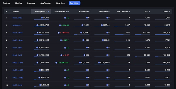 NFTScan 对排名前 1000 的 NFT 持仓价值钱包地址进行了分析,当前持有价值排名前 10 如下图所示: