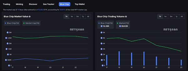当前 19 只蓝筹合约总市值为 675,063 ETH,占 NFT 总市值的 26.81%。