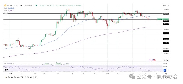如果14日RSI读数为37.40,比特币可能会跌破63000美元的水平,然后进入超卖区域。