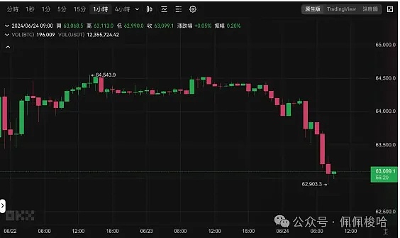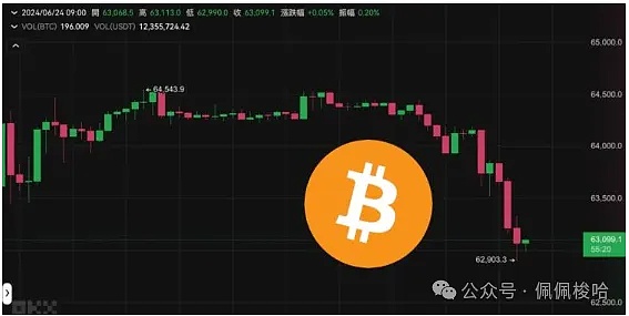 比特币在周末两日持续在6.4 万美元窄幅震荡,不过在今(24)晨四点左右再次开启新一波下跌,稍早八点左右最低下探62,903 美元,创下五月中以来最低点。