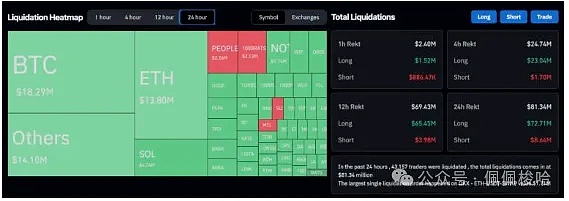 比特币下跌波动中,据Coinglass数据显示,过去24 小时,加密货币全网爆仓金额超过8134 万美元(多头占7200 万美元),有近4.3 万人遭清算。