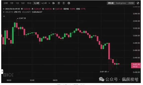 以太坊部分,走势与比特币雷同,今(24)晨四点左右最低下探3,401 美元。撰稿当下报3,421 美元,近24 小时下跌2.51%。